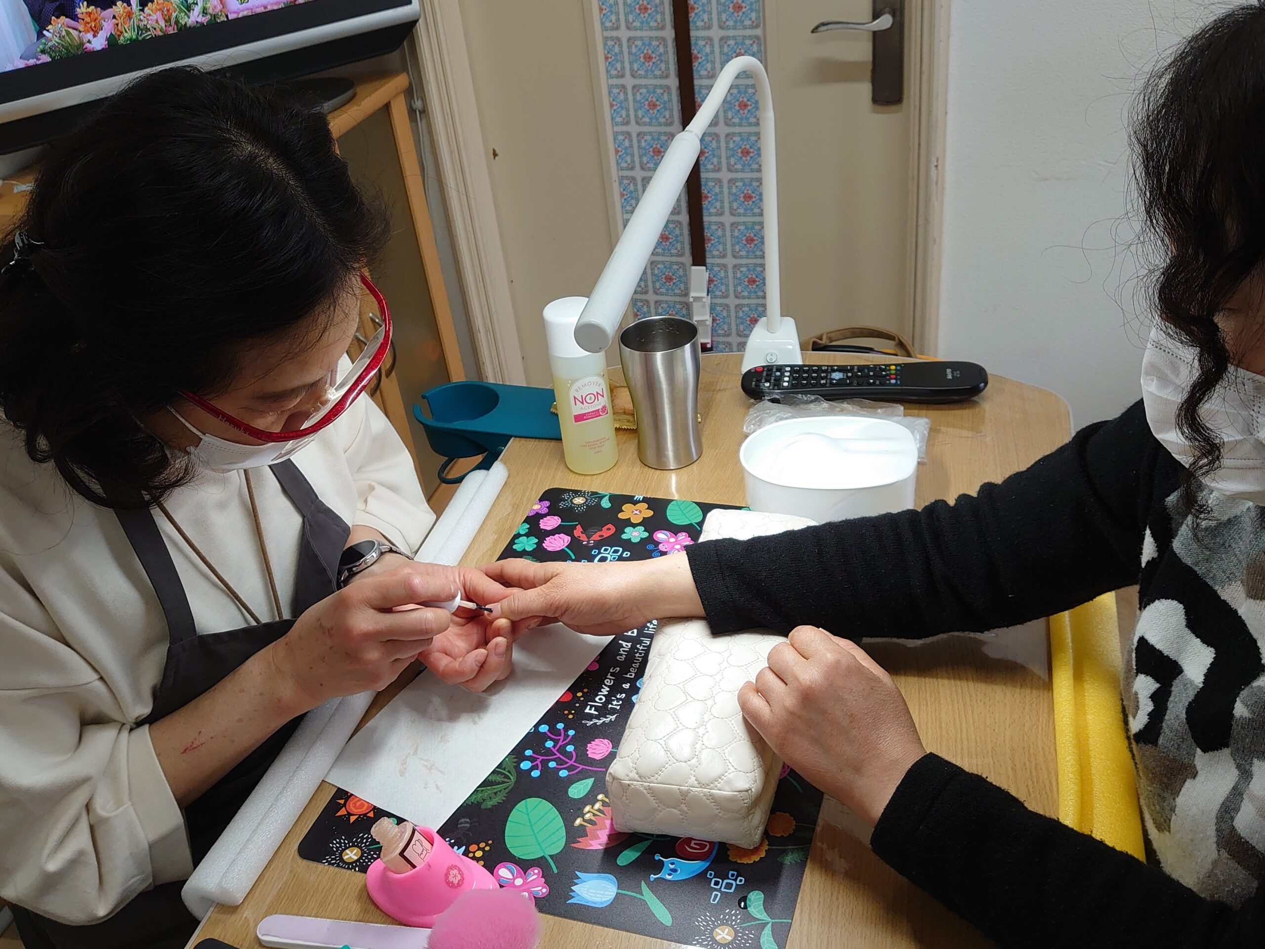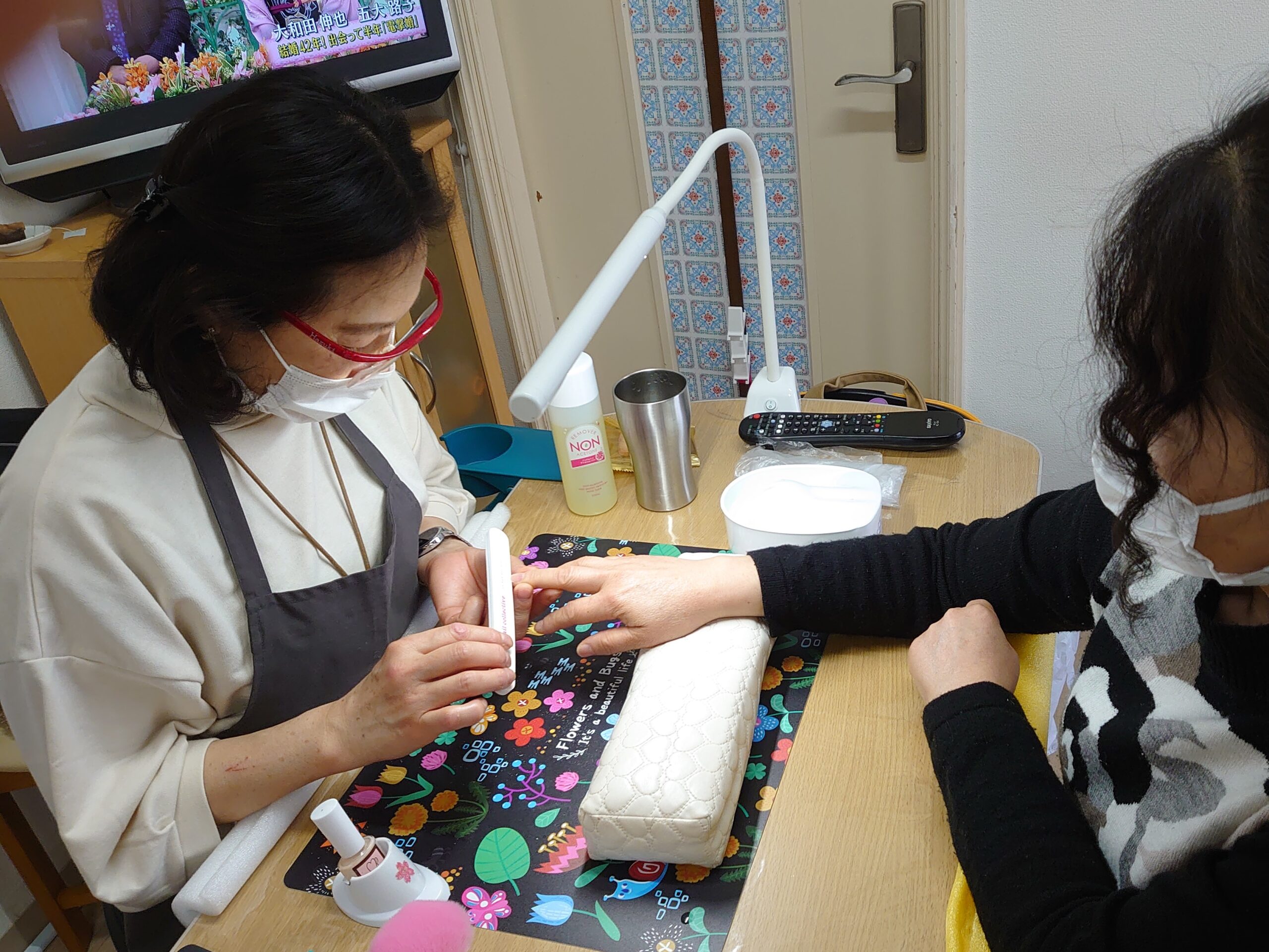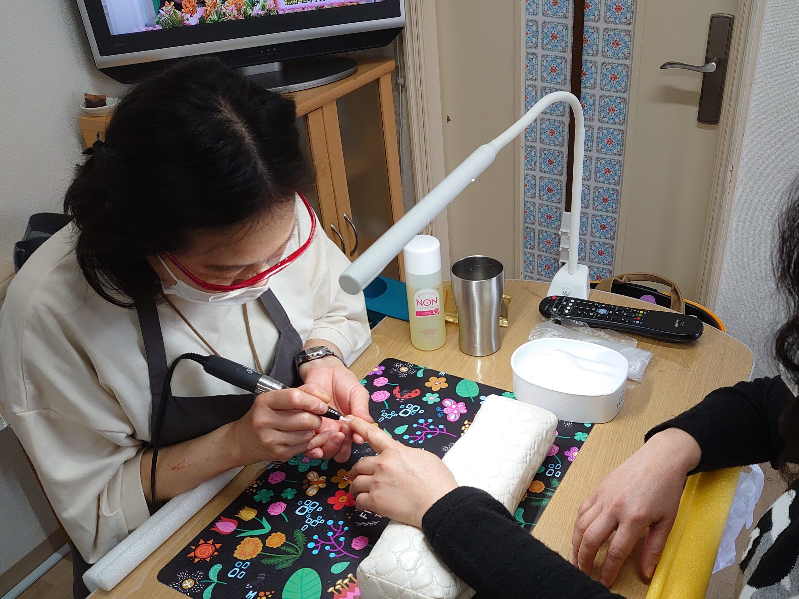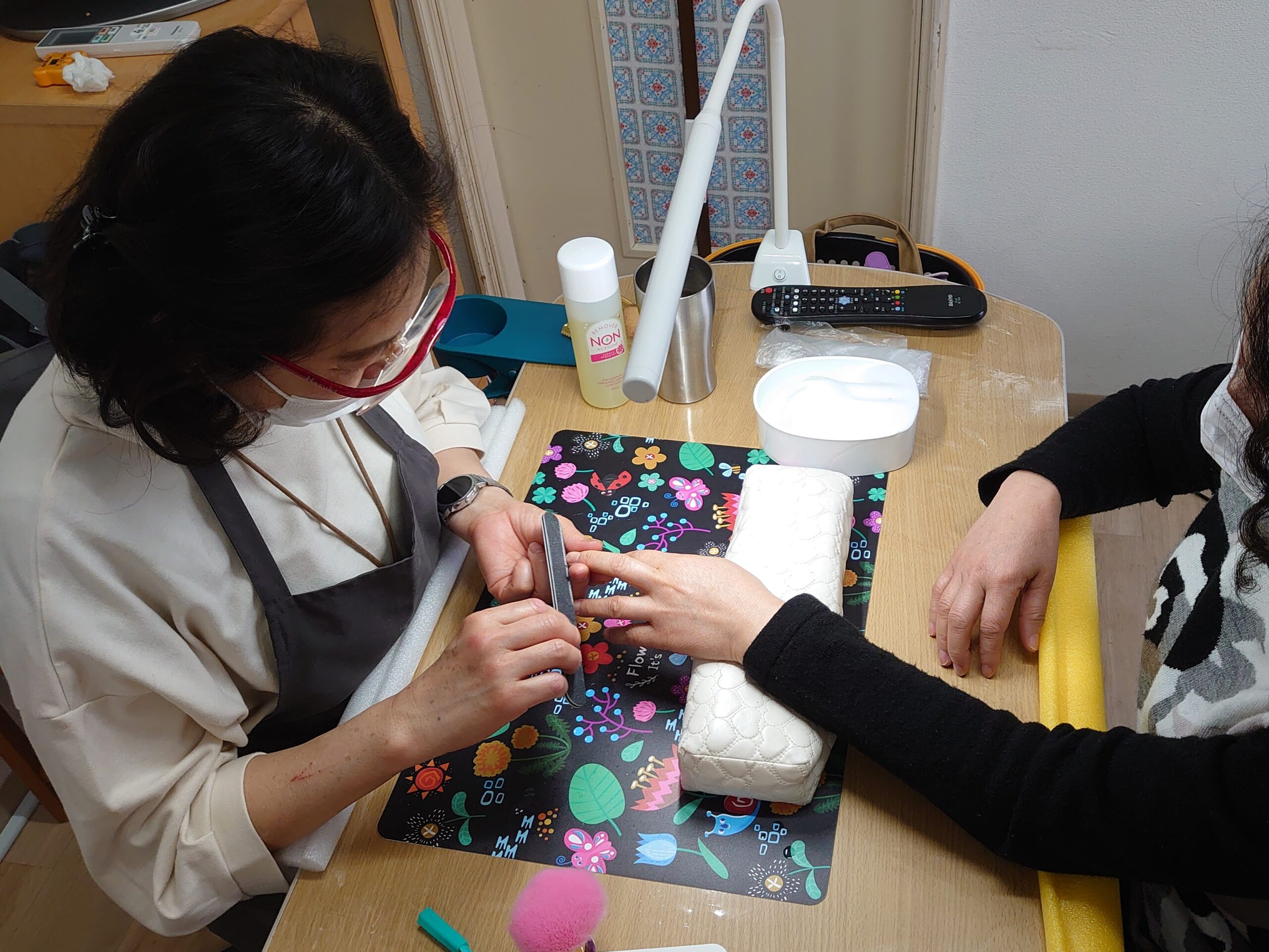 - ご希望の爪の長さ等を相談しながら爪やすりでネイルの形を整えていきます。(爪やすりの合間に片手をお湯に浸して甘皮を柔らかくします)