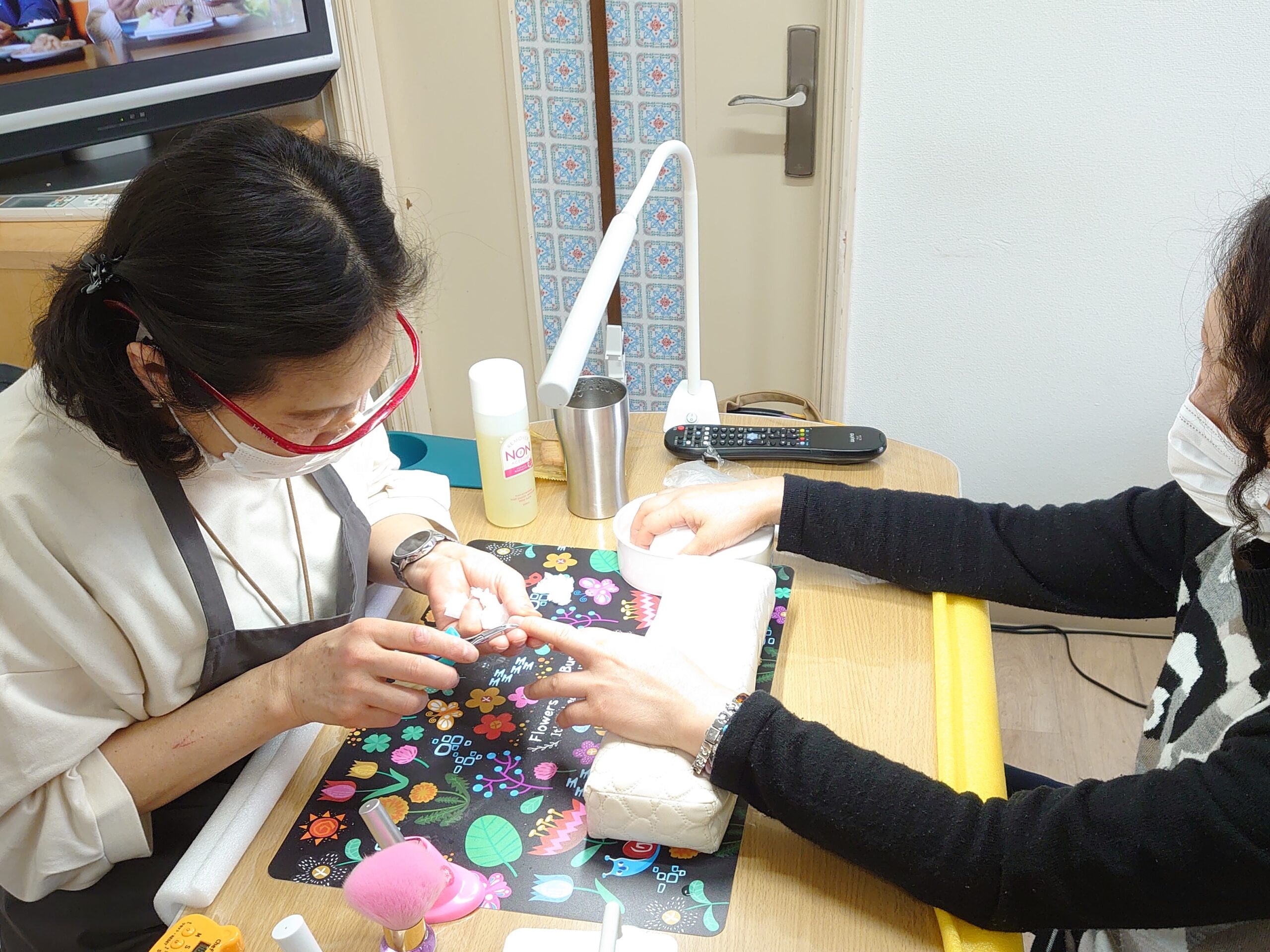 - 片足ずつ、爪切りと爪やすりを使って爪の長さや形を整えていきます。